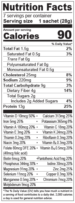 Ingredients: Whey protein concentrate, soy protein isolate, soluble corn fiber, rice flour, sugar, baking powder (sodium acid, pyrophosphate, sodium bicarbonate, corn starch, monocalcium phosphate), contains 2% or less of canola oil, soy lecithin, natural flavors, steviol glycoside, Bacillus coagulans GBI-30 6086.